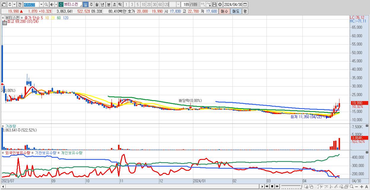 - 뷰티스킨 (19,990원 ▲ 10.32% , 시총: 706억, 거래량: 3,863,641, 거래대금:804억)