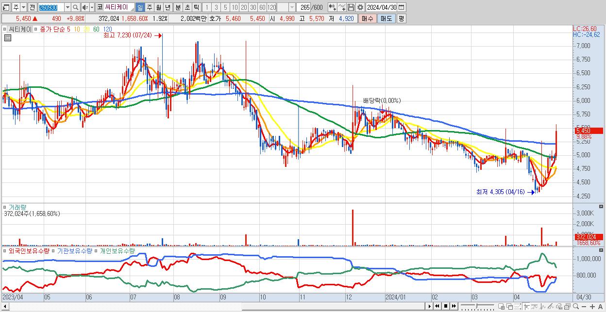 - 씨티케이 (5,450원 ▲ 9.88% , 시총: 1,054억, 거래량: 372,024, 거래대금:20억)