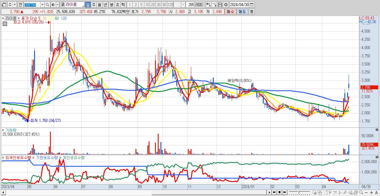 - 라이콤 (2,790원 ▲ 11.82% , 시총: 835억, 거래량: 25,508,639, 거래대금:766억)
