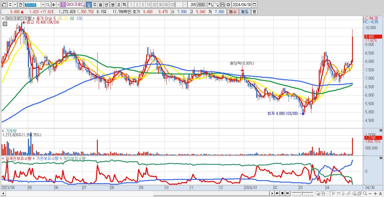 - 마이크로디지탈 (9,480원 ▲ 17.62% , 시총: 1,482억, 거래량: 1,273,828, 거래대금:118억)