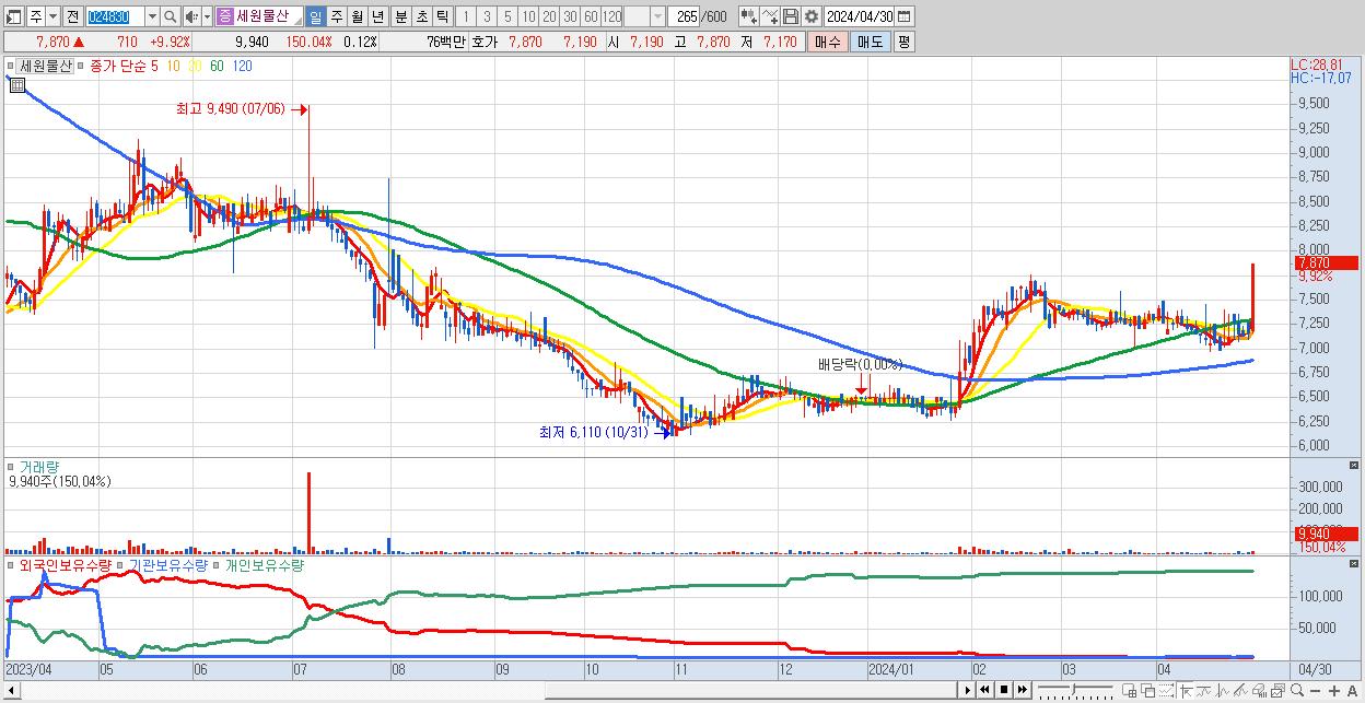 - 세원물산 (7,870원 ▲ 9.92% , 시총: 657억, 거래량: 9,940, 거래대금:1억)