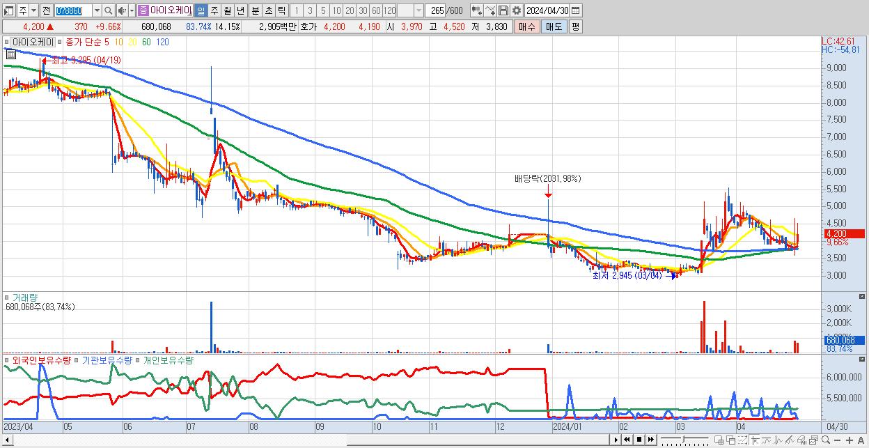 - 아이오케이 (4,200원 ▲ 9.66% , 시총: 202억, 거래량: 680,068, 거래대금:29억)