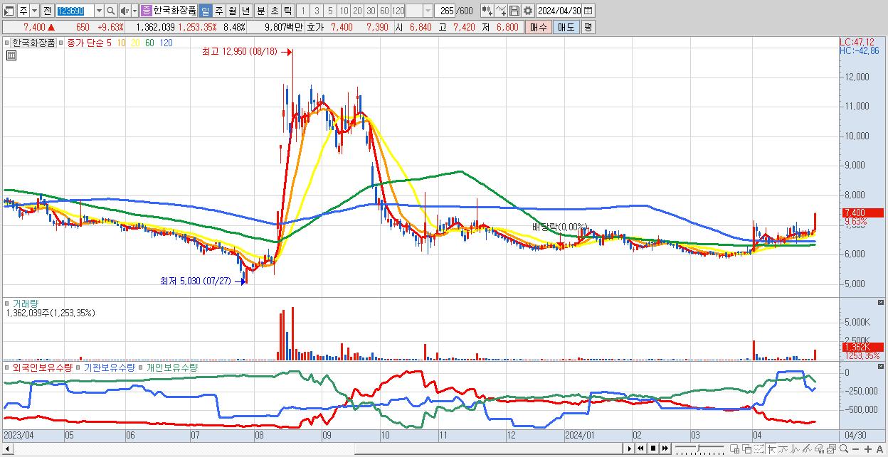 - 한국화장품 (7,400원 ▲ 9.63% , 시총: 1,189억, 거래량: 1,362,039, 거래대금:98억)