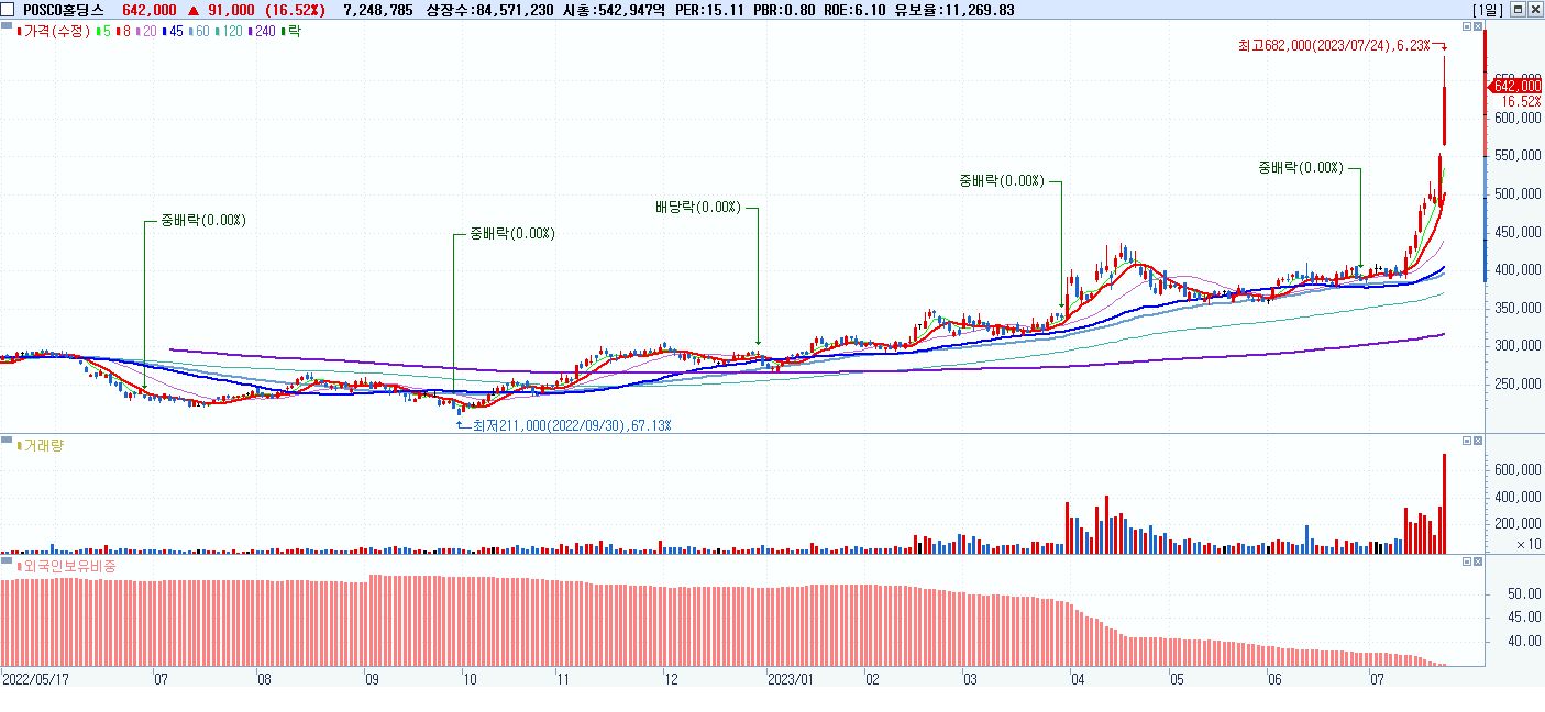 포스코그룹 지주사 POSCO홀딩스(포스코홀딩스)의 주가가 하루 만에 16% 급등하며 코스피 시가총액 4위에 올랐다. 24일 유가증권시장에서 포스코홀딩스는 전장보다 9만1000원(16.52%) 오른 64만2000원에 거래를 마쳤다. 포스코홀딩스는 이날 장중 한때 23.77% 상승한 68만2000원까지 오르며 52주 신고가도 갈아치웠다. 이날 종가를 기준으로…