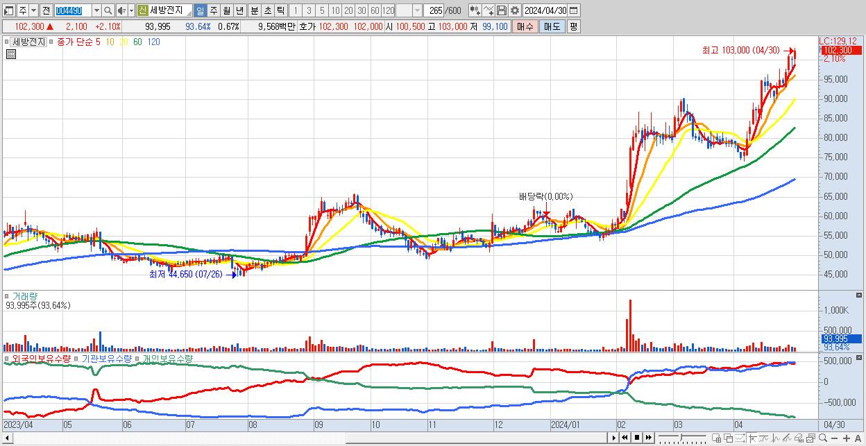 세방전지 102,300원 ▲ 2.1% (KOSPI, 004490)