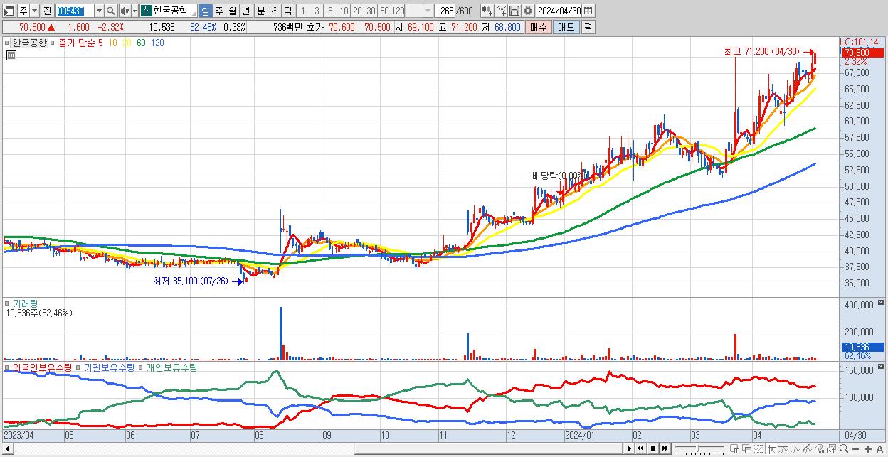 - 한국공항 (70,600원 ▲ 2.32% , 시총: 2,235억, 거래량: 10,536, 거래대금:7억, KOSPI)