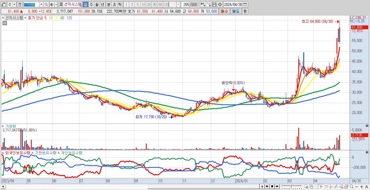 - 선익시스템 (61,400원 ▲ 12.45% , 시총: 5,830억, 거래량: 3,717,047, 거래대금:2,227억, KOSDAQ)