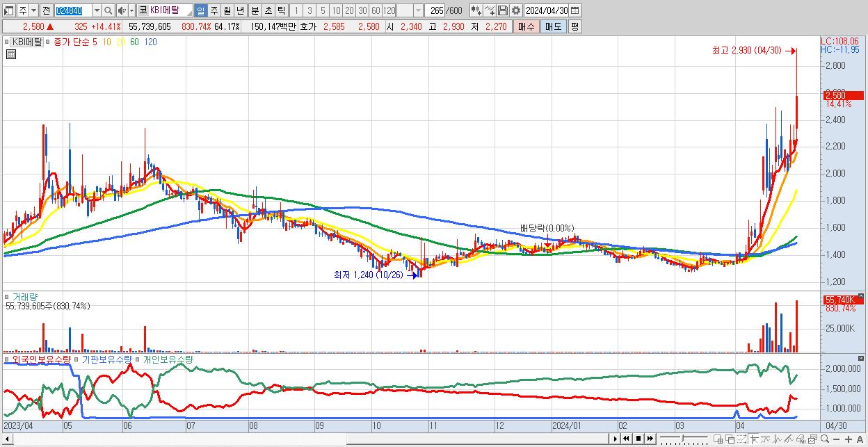 - KBI메탈 (2,580원 ▲ 14.41% , 시총: 876억, 거래량: 55,739,605, 거래대금:1,501억, KOSDAQ)