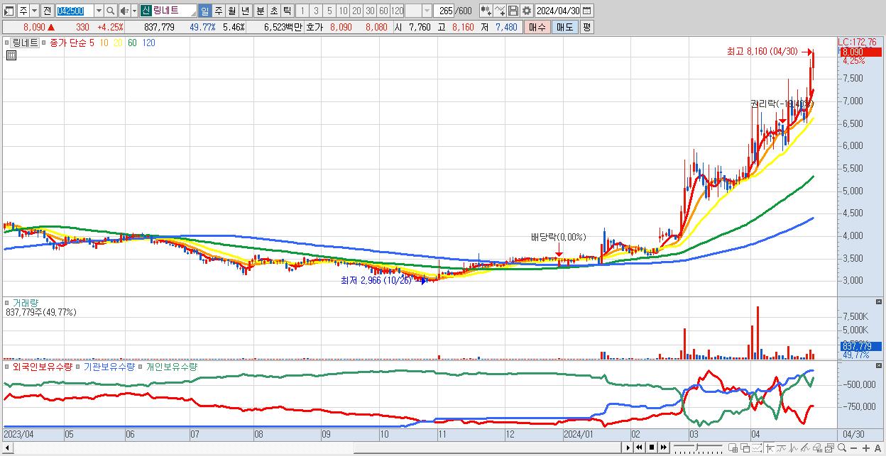 - 링네트 (8,090원 ▲ 4.25% , 시총: 1,242억, 거래량: 837,779, 거래대금:65억, KOSDAQ)