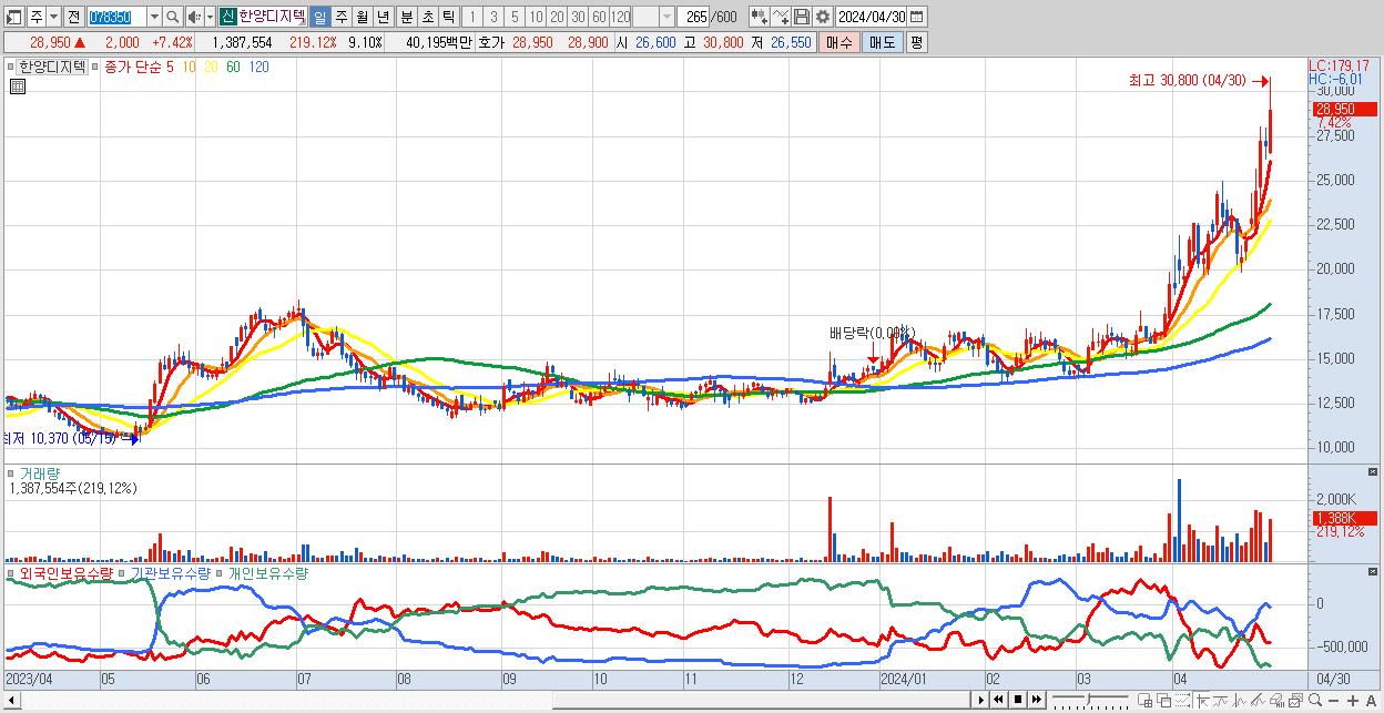 - 한양디지텍 (28,950원 ▲ 7.42% , 시총: 4,413억, 거래량: 1,387,554, 거래대금:402억, KOSDAQ)