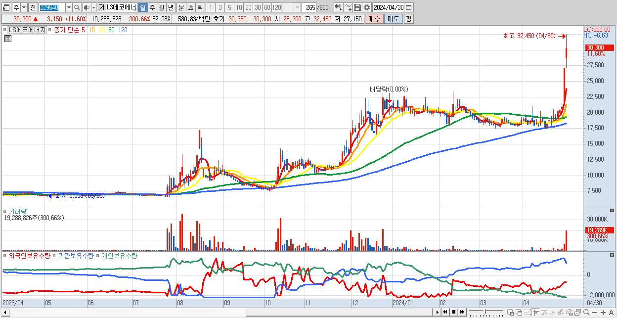 - LS에코에너지 (30,300원 ▲ 11.6% , 시총: 9,279억, 거래량: 19,288,826, 거래대금:5,808억, KOSPI)