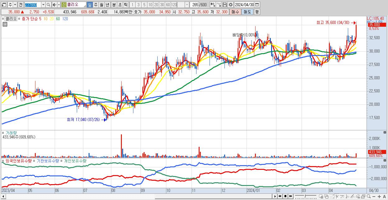 - 클리오 (35,000원 ▲ 8.53% , 시총: 6,325억, 거래량: 433,946, 거래대금:149억, KOSDAQ)