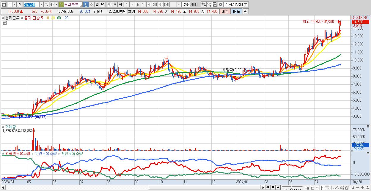 - 실리콘투 (14,800원 ▲ 3.64% , 시총: 8,938억, 거래량: 1,576,605, 거래대금:233억, KOSDAQ)