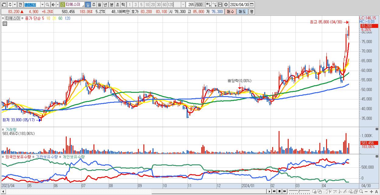 - 티에스이 (83,200원 ▲ 6.26% , 시총: 9,203억, 거래량: 583,456, 거래대금:482억, KOSDAQ)