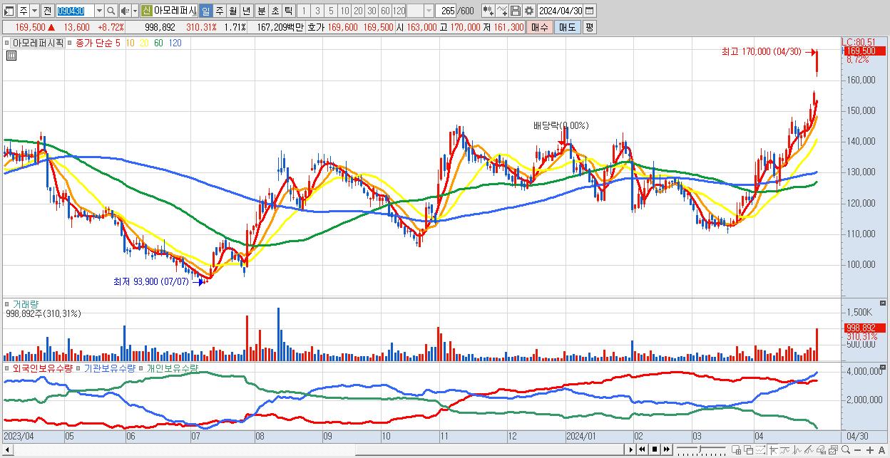 - 아모레퍼시픽 (169,500원 ▲ 8.72% , 시총: 99,145억, 거래량: 998,892, 거래대금:1,672억, KOSPI)