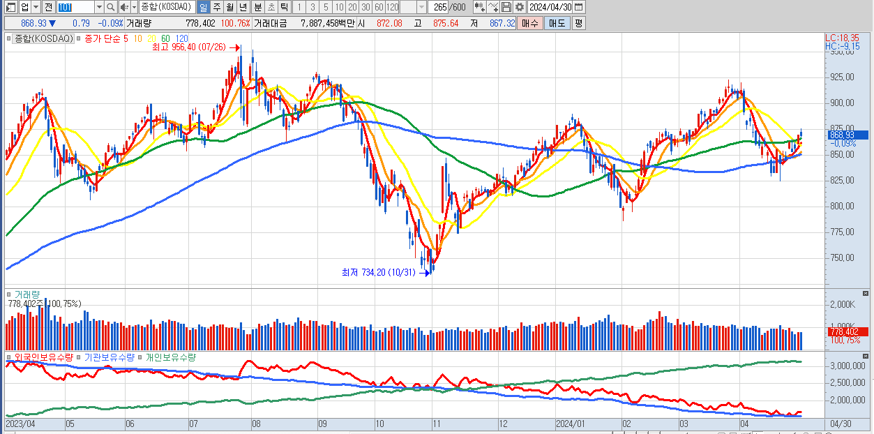 | 04/24 | 862.23 | ▲1.99% | -2,444억 | 1,826억 | 727억 | -109억 |