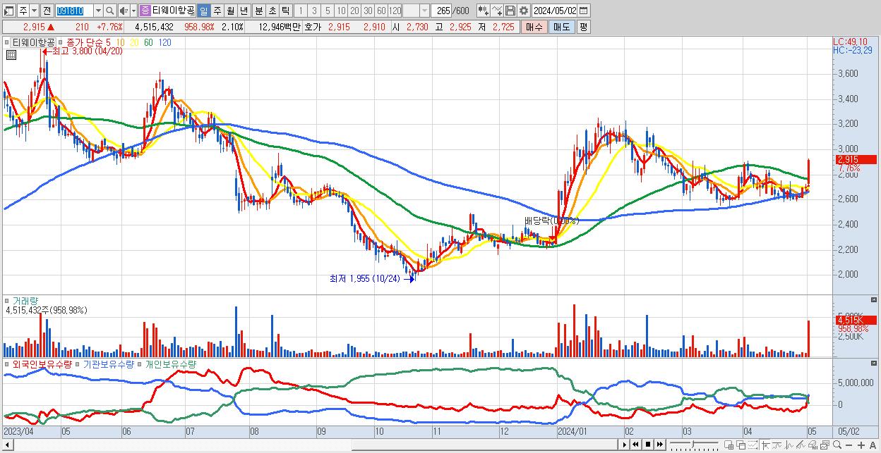 - 티웨이항공 (2,915원 ▲ 7.76% , 시총: 6,278억, 외국인 순매수 거래금:29억)