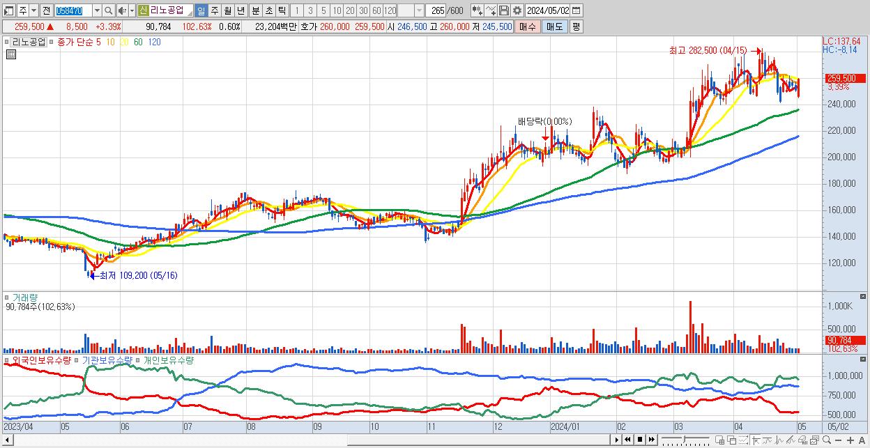 - 리노공업 (259,500원 ▲ 3.39% , 시총: 39,554억, 외국인 순매수 거래금:42억)