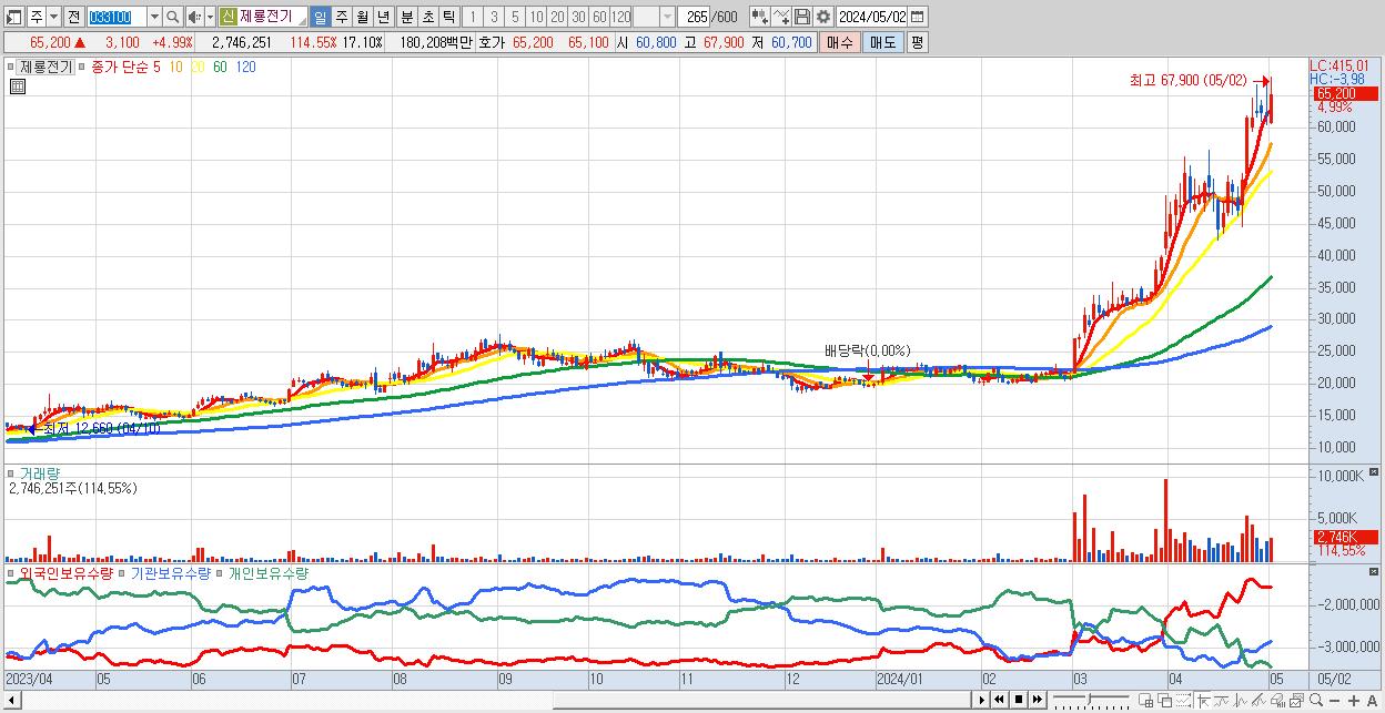 - 제룡전기 (65,200원 ▲ 4.99% , 시총: 10,473억, 외국인 순매수 거래금:32억)