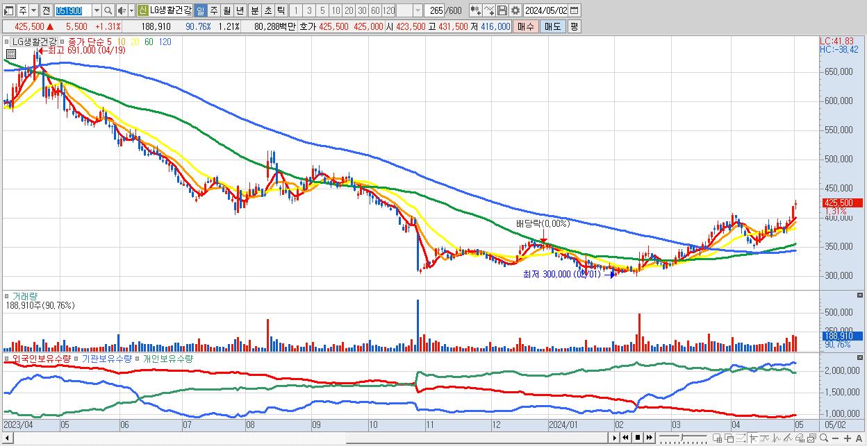 - LG생활건강 (425,500원 ▲ 1.31% , 시총: 66,455억, 외국인 순매수 거래금:86억)