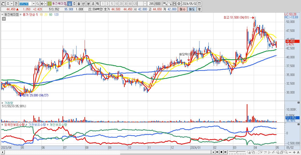 - 동진쎄미켐 (44,450원 ▲ 2.42% , 시총: 22,854억, 외국인 순매수 거래금:34억)