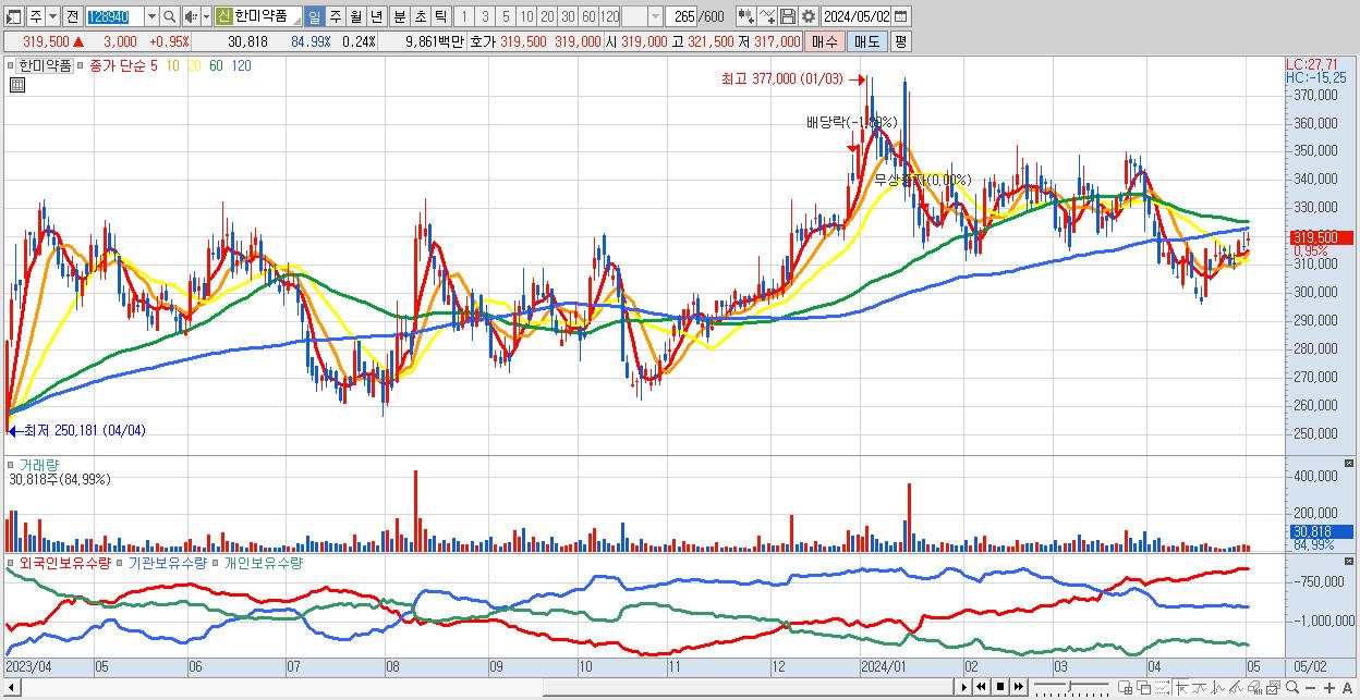 - 한미약품 (319,500원 ▲ 0.95% , 시총: 40,931억, 외국인 순매수 거래금:34억)