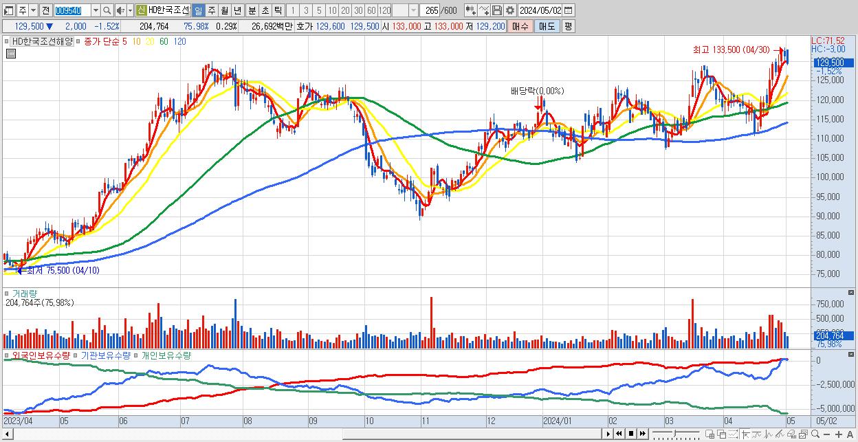 30.HD한국조선해양 129,500원 ▼ -1.52% (KOSPI, 009540)
