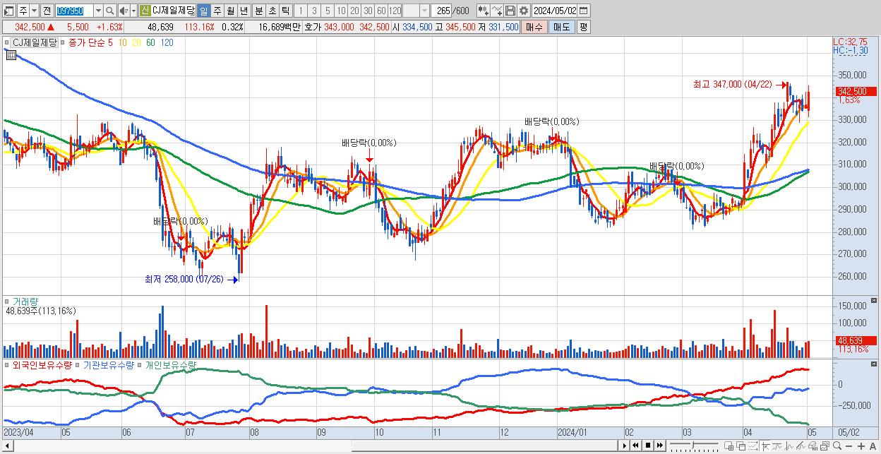 - CJ제일제당 (342,500원 ▲ 1.63% , 시총: 51,561억, 외국인 순매수 거래금:30억)