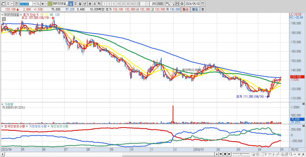 - BGF리테일 (133,100원 ▲ 1.53% , 시총: 23,005억, 외국인 순매수 거래금:33억)