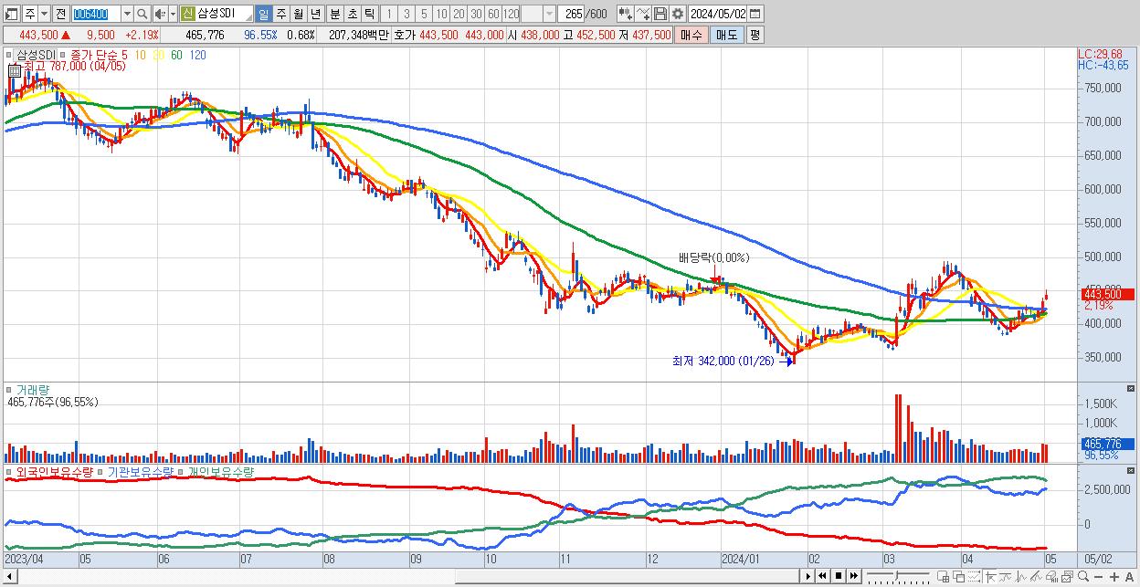 - 삼성SDI (443,500원 ▲ 2.19% , 시총: 304,971억, 외국인 순매수 거래금:288억)