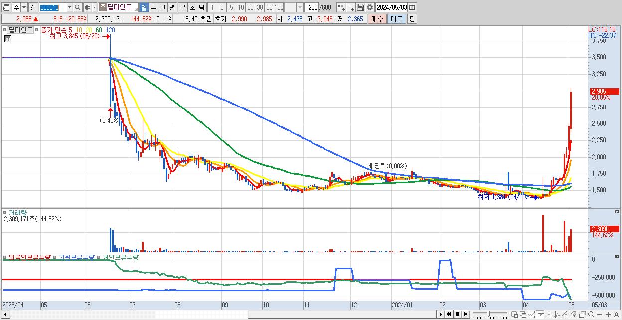 - 딥마인드 (2,985원 ▲ 20.85% , 시총: 682억, 거래량: 2,309,171, 거래대금:65억)