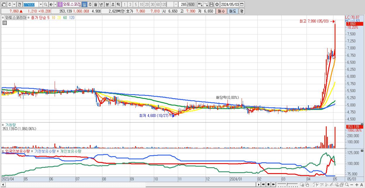 - 와토스코리아 (7,860원 ▲ 18.2% , 시총: 566억, 거래량: 353,139, 거래대금:26억)