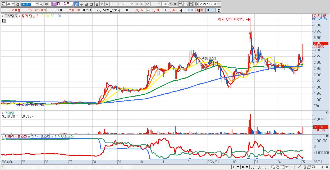 - 다보링크 (3,260원 ▲ 29.88% , 시총: 1,414억, 거래량: 9,010,031, 거래대금:273억)