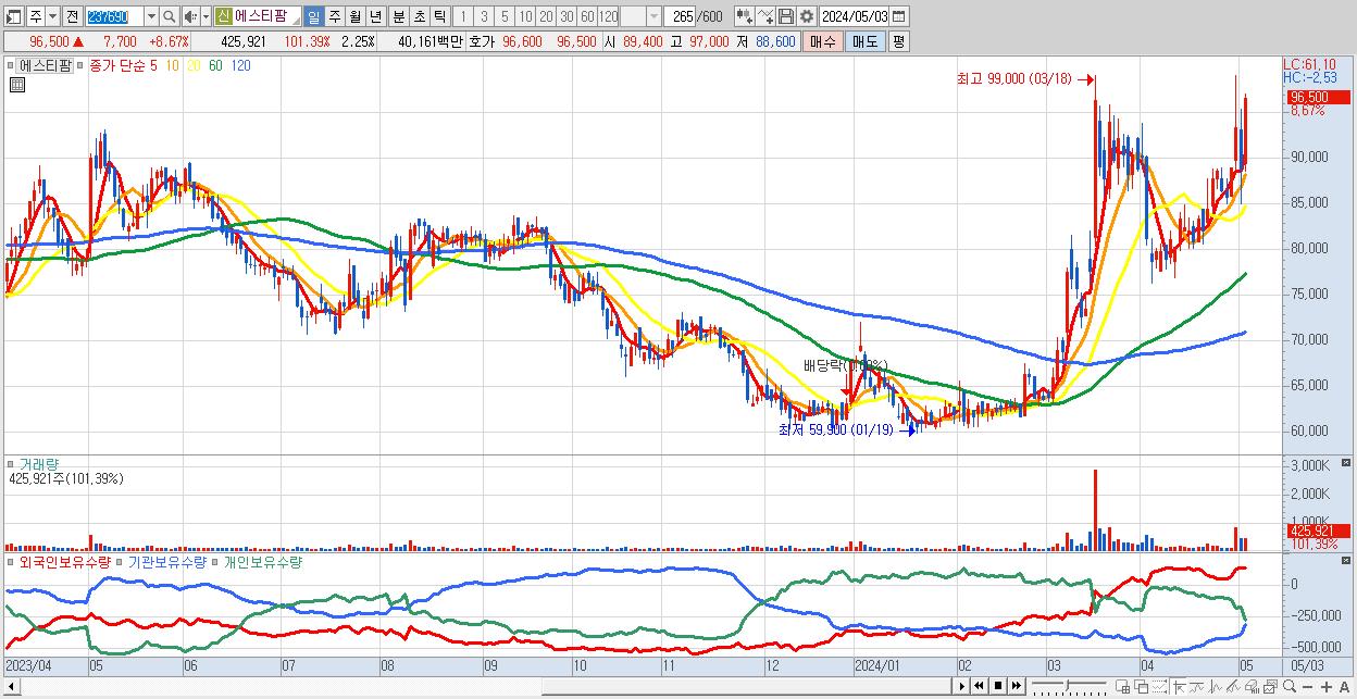 - 에스티팜 (96,500원 ▲ 8.67% , 시총: 18,271억, 거래량: 425,921, 거래대금:402억)