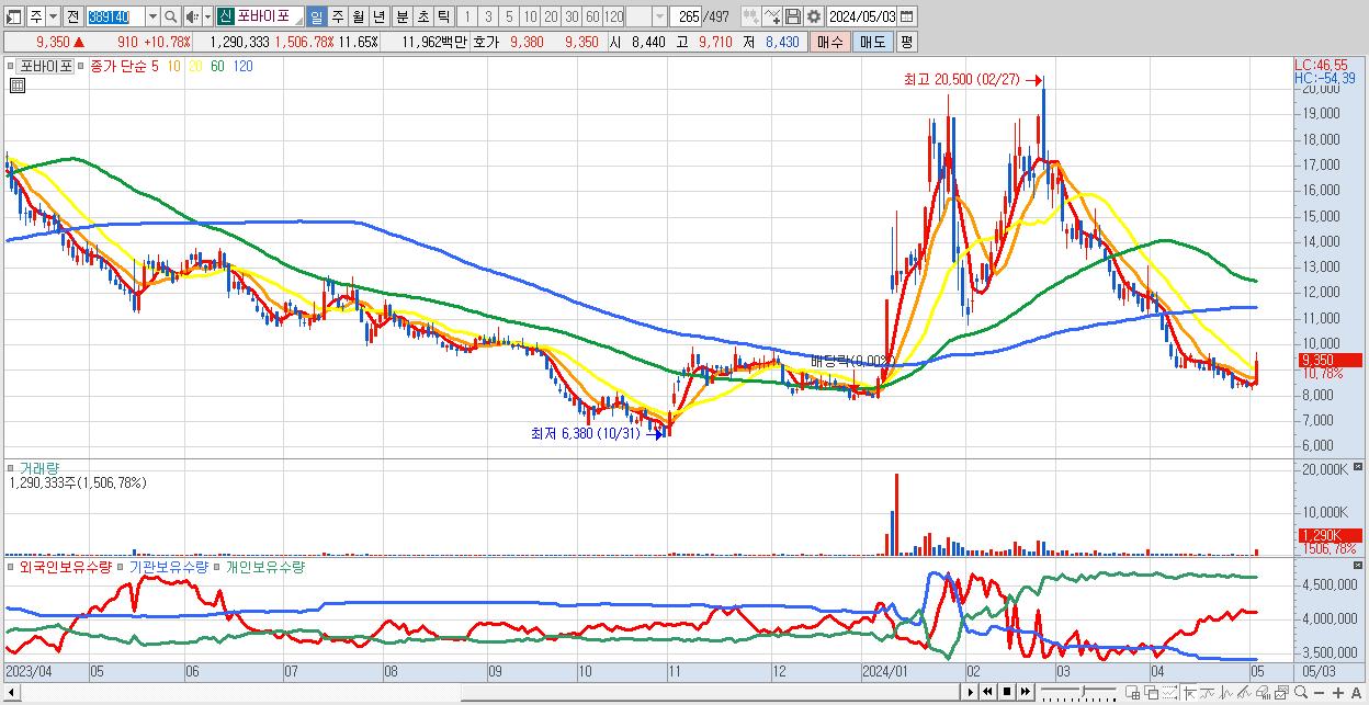 - 포바이포 (9,350원 ▲ 10.78% , 시총: 1,035억, 거래량: 1,290,333, 거래대금:120억)