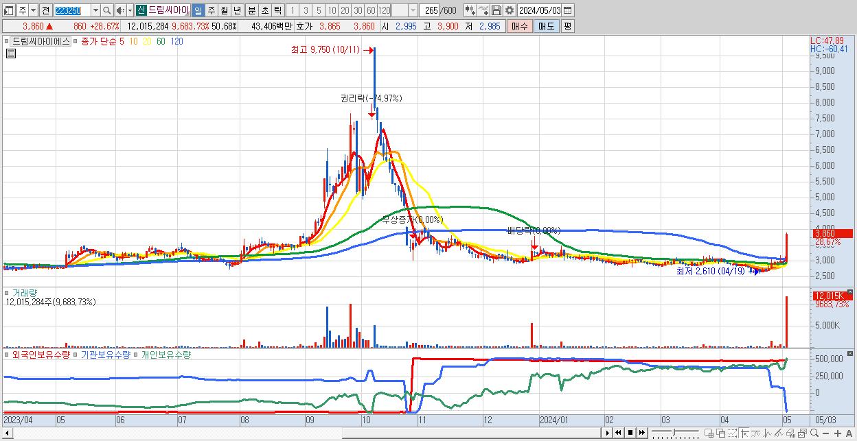 - 드림씨아이에스 (3,860원 ▲ 28.67% , 시총: 915억, 거래량: 12,015,284, 거래대금:434억)