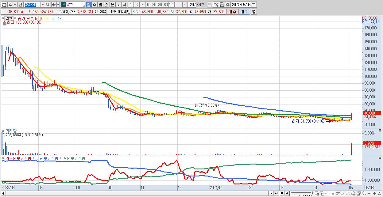 - 알멕 (46,600원 ▲ 24.43% , 시총: 2,978억, 거래량: 2,708,788, 거래대금:1,251억)