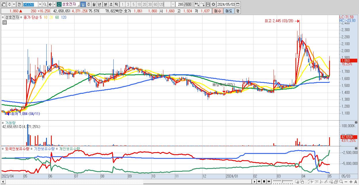 - 성호전자 (1,860원 ▲ 16.25% , 시총: 1,050억, 거래량: 42,658,651, 거래대금:788억)