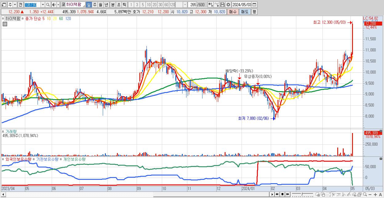 - 하이텍팜 (12,200원 ▲ 12.44% , 시총: 1,297억, 거래량: 495,309, 거래대금:59억)