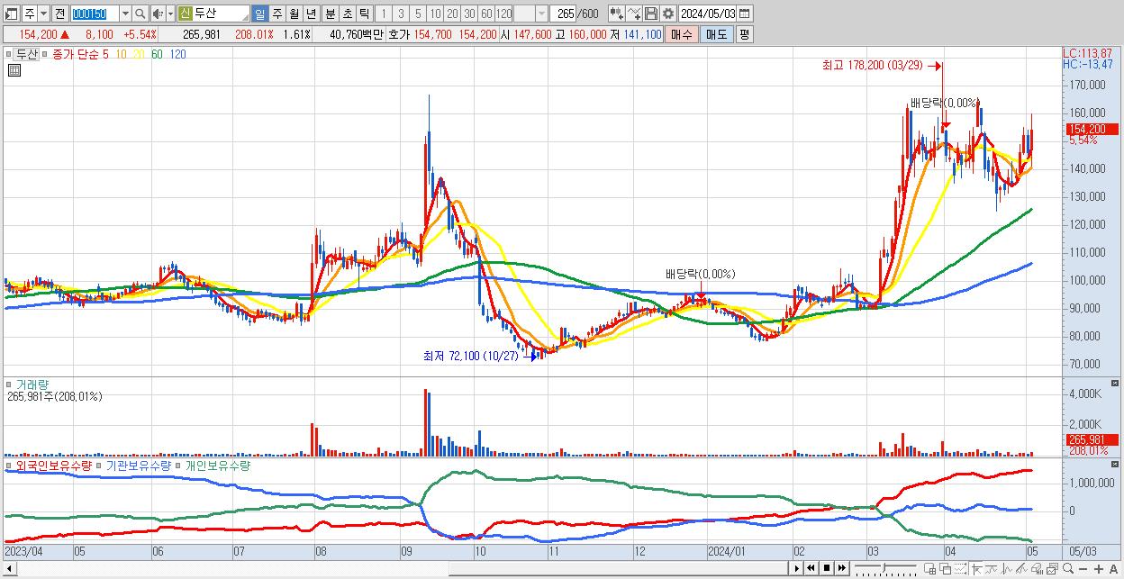- 두산 (154,200원 ▲ 5.54% , 시총: 25,480억, 외국인 순매수 거래금:97억)