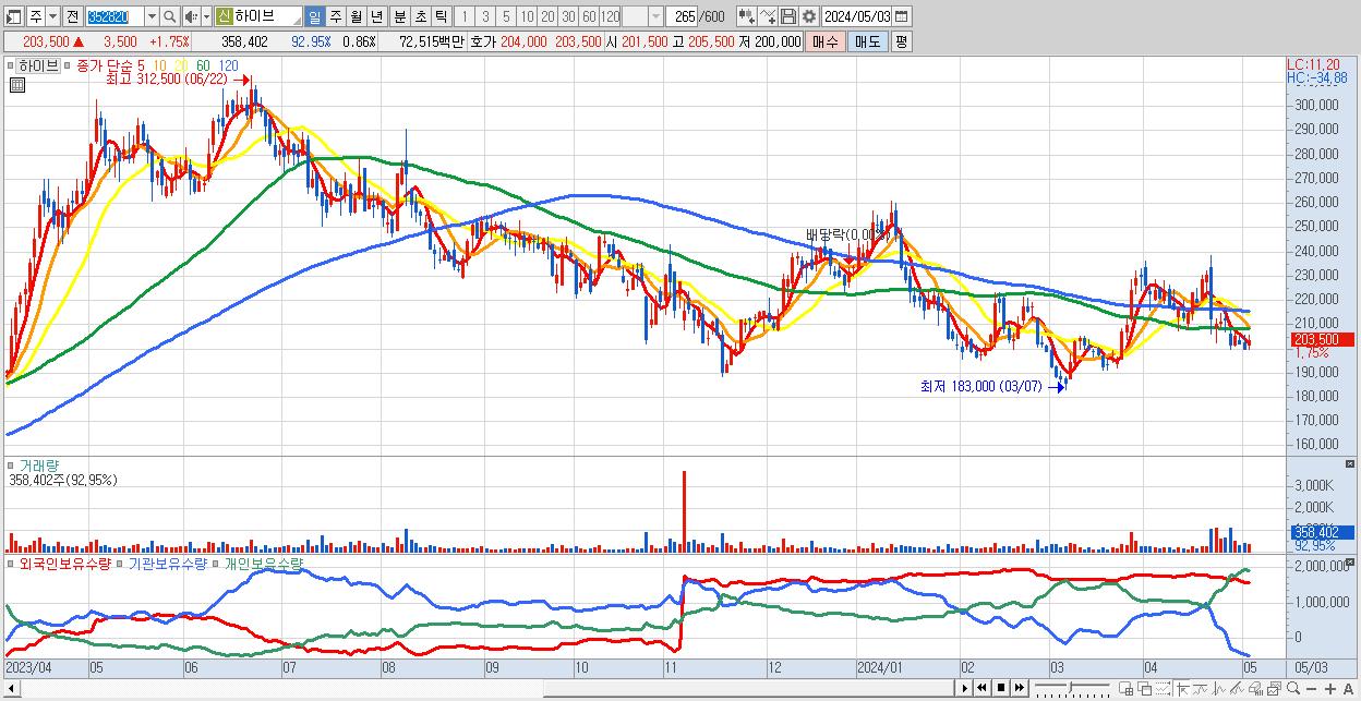 - 하이브 (203,500원 ▲ 1.75% , 시총: 84,762억, 외국인 순매수 거래금:108억)