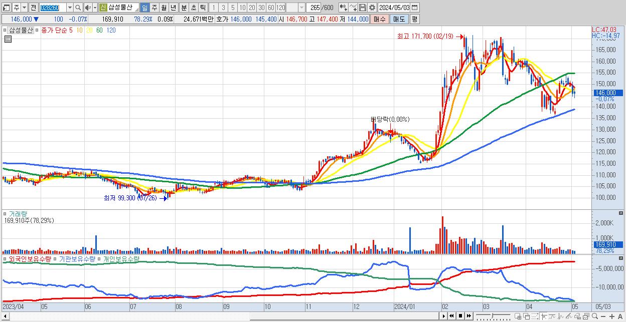 - 삼성물산 (146,000원 ▼ -0.07% , 시총: 270,964억, 외국인 순매수 거래금:58억)