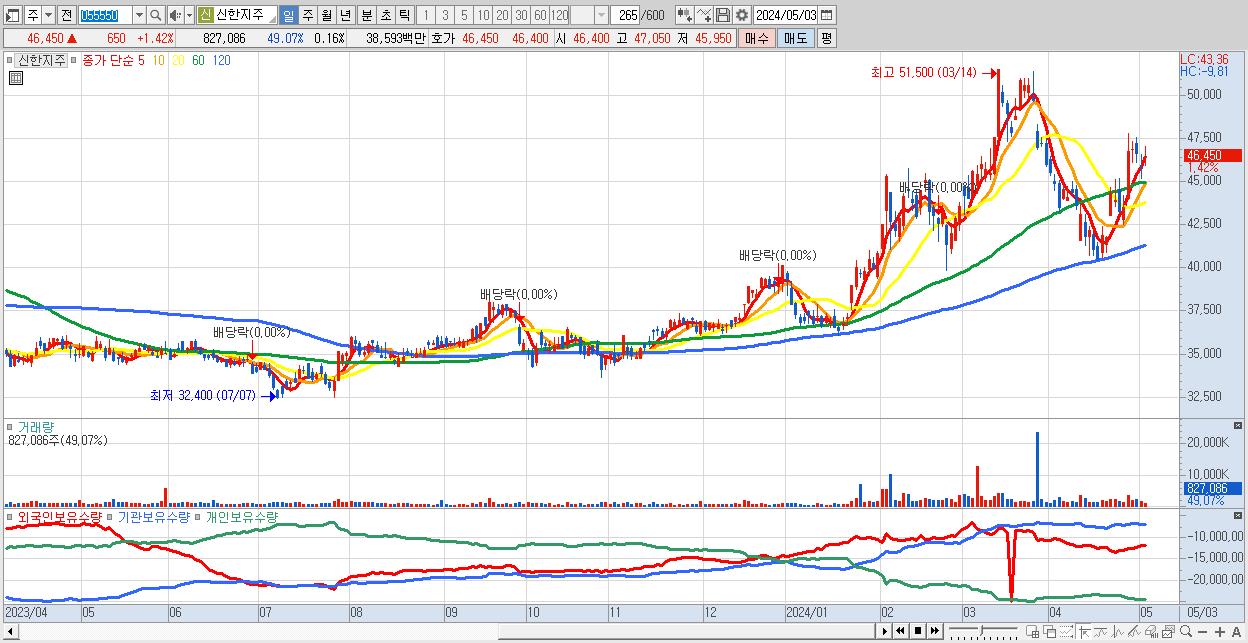 - 신한지주 (46,450원 ▲ 1.42% , 시총: 236,613억, 외국인 순매수 거래금:57억)