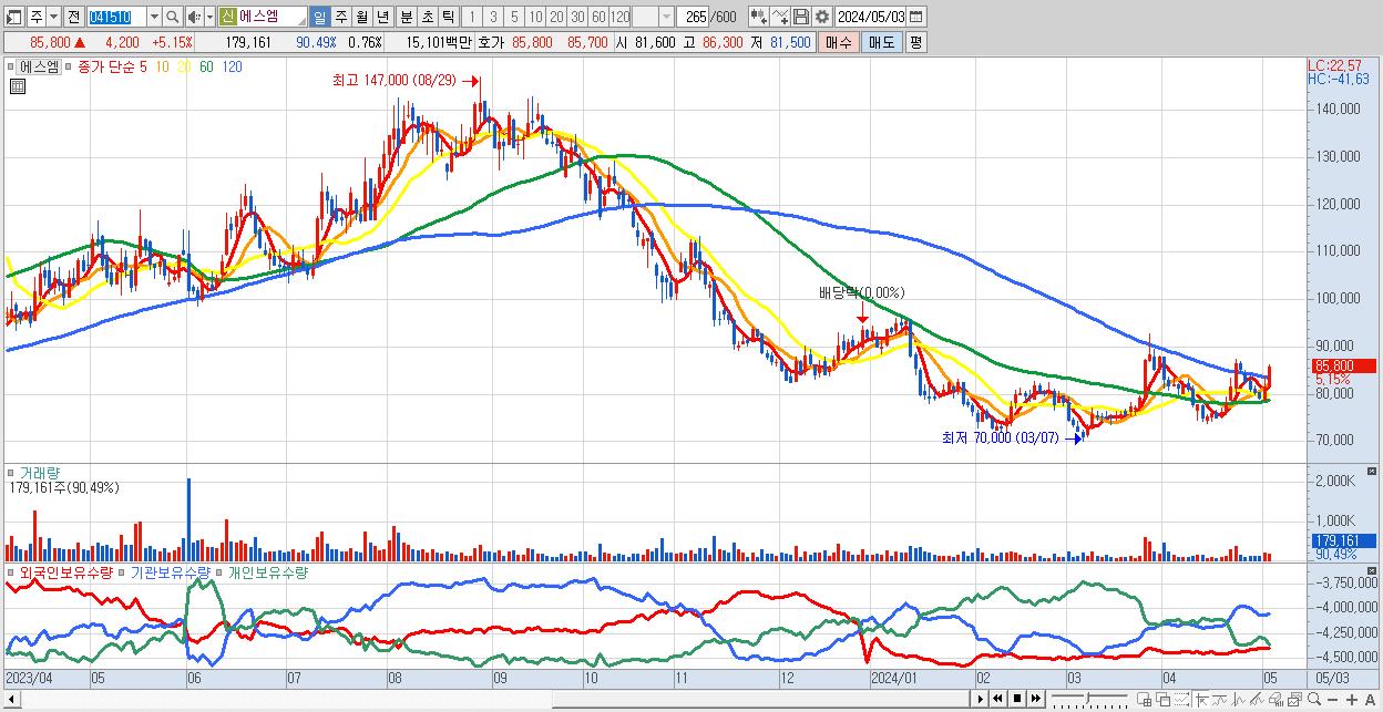 - 에스엠 (85,800원 ▲ 5.15% , 시총: 20,240억, 외국인 순매수 거래금:45억)