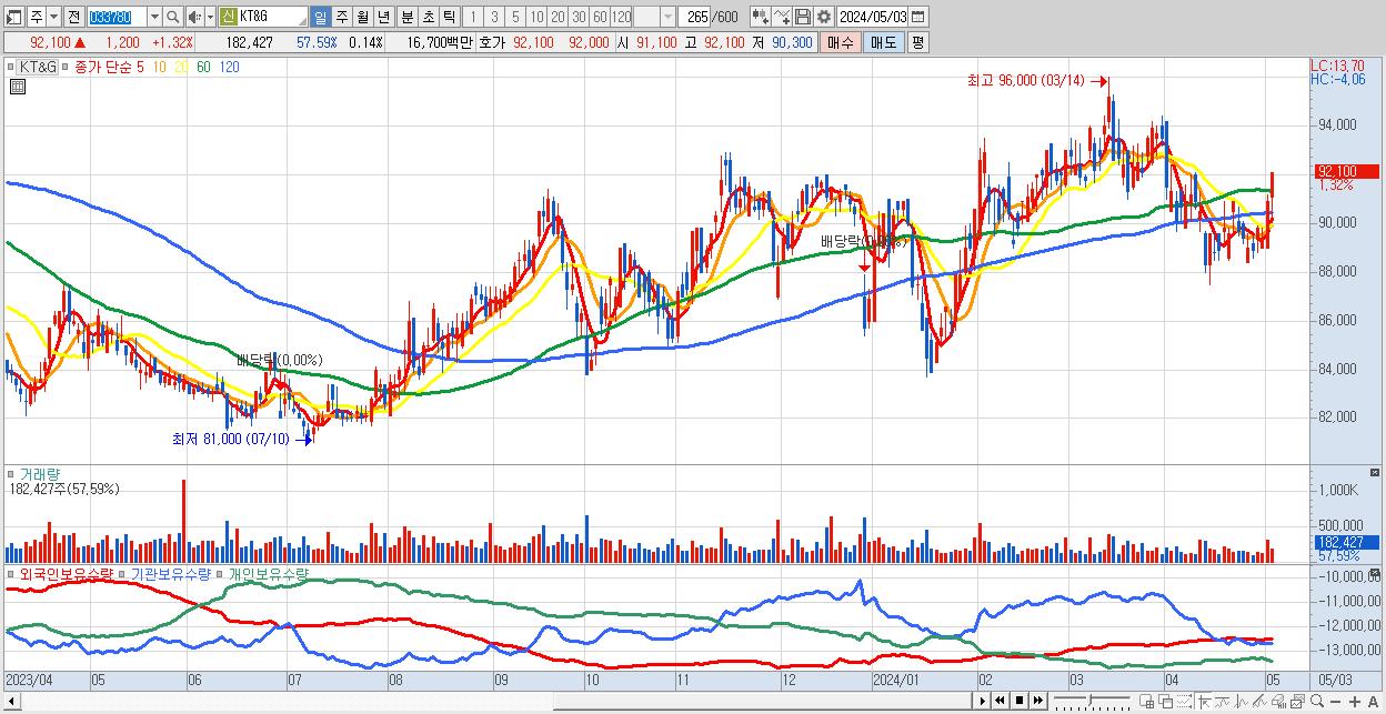 - KT&G (92,100원 ▲ 1.32% , 시총: 120,027억, 외국인 순매수 거래금:56억)