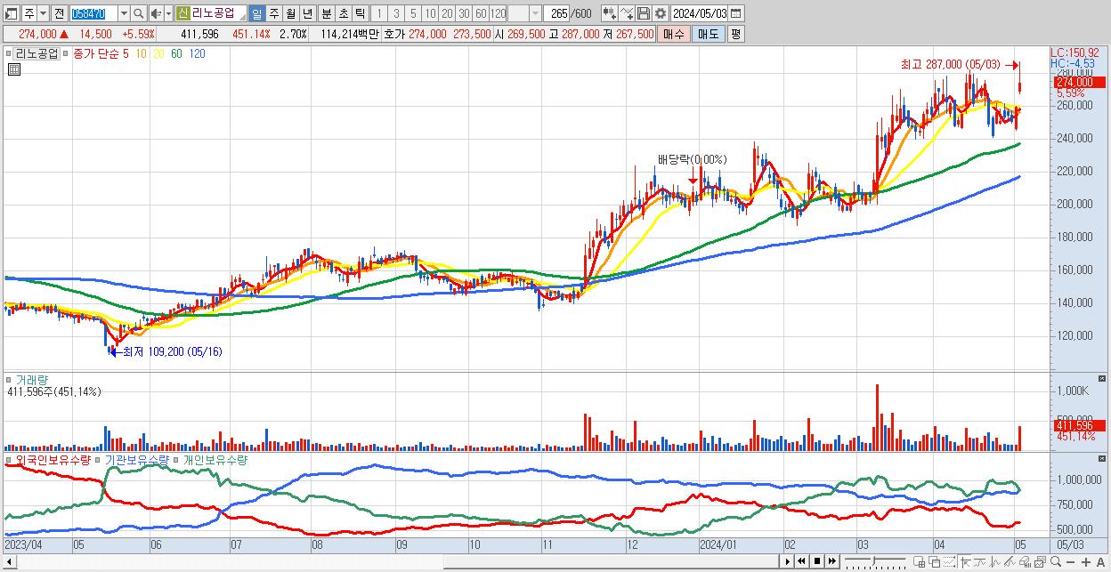 - 리노공업 (274,000원 ▲ 5.59% , 시총: 41,764억, 외국인 순매수 거래금:96억)