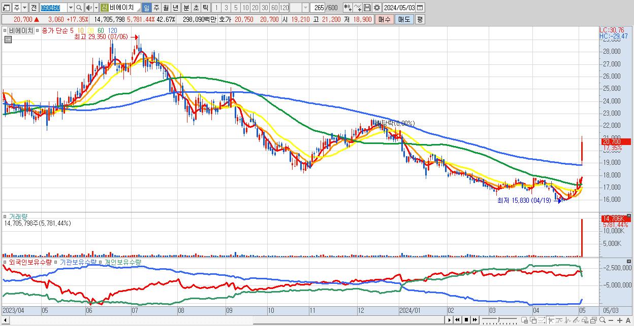- 비에이치 (20,700원 ▲ 17.35% , 시총: 7,134억, 외국인 순매수 거래금:134억)