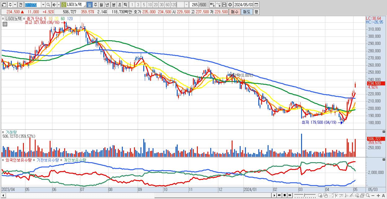 - LG이노텍 (234,500원 ▲ 4.92% , 시총: 55,499억, 외국인 순매수 거래금:190억)