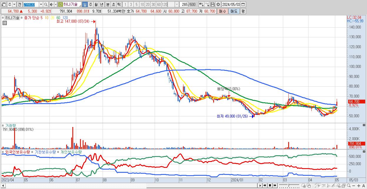 - 하나기술 (64,700원 ▲ 8.92% , 시총: 5,280억, 외국인 순매수 거래금:50억)