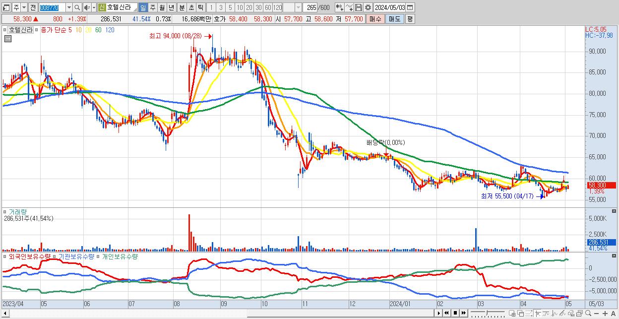 - 호텔신라 (58,300원 ▲ 1.39% , 시총: 22,882억, 외국인 순매수 거래금:84억)